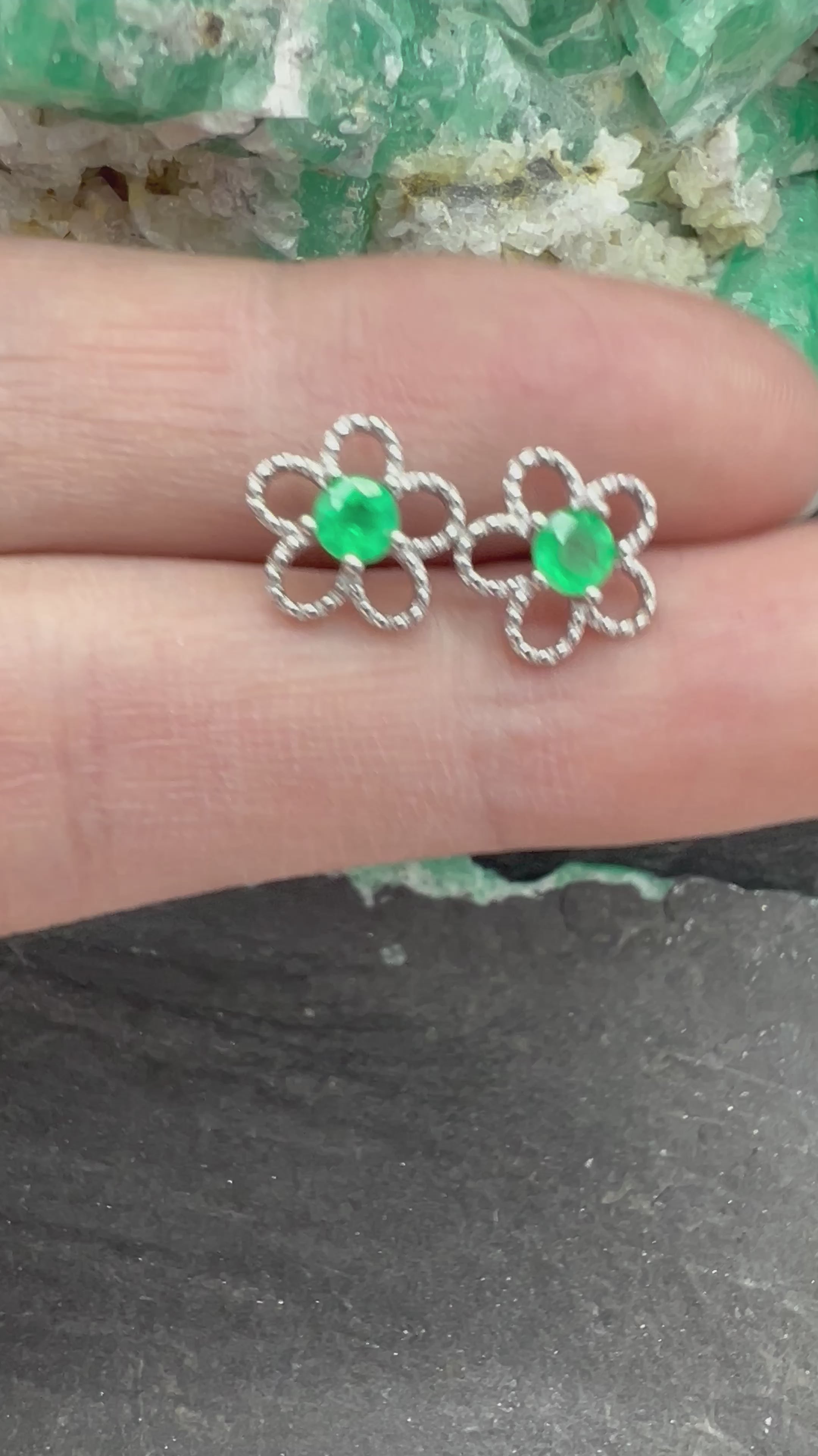 Pendientes de plata de ley con flor abierta y esmeralda redonda central