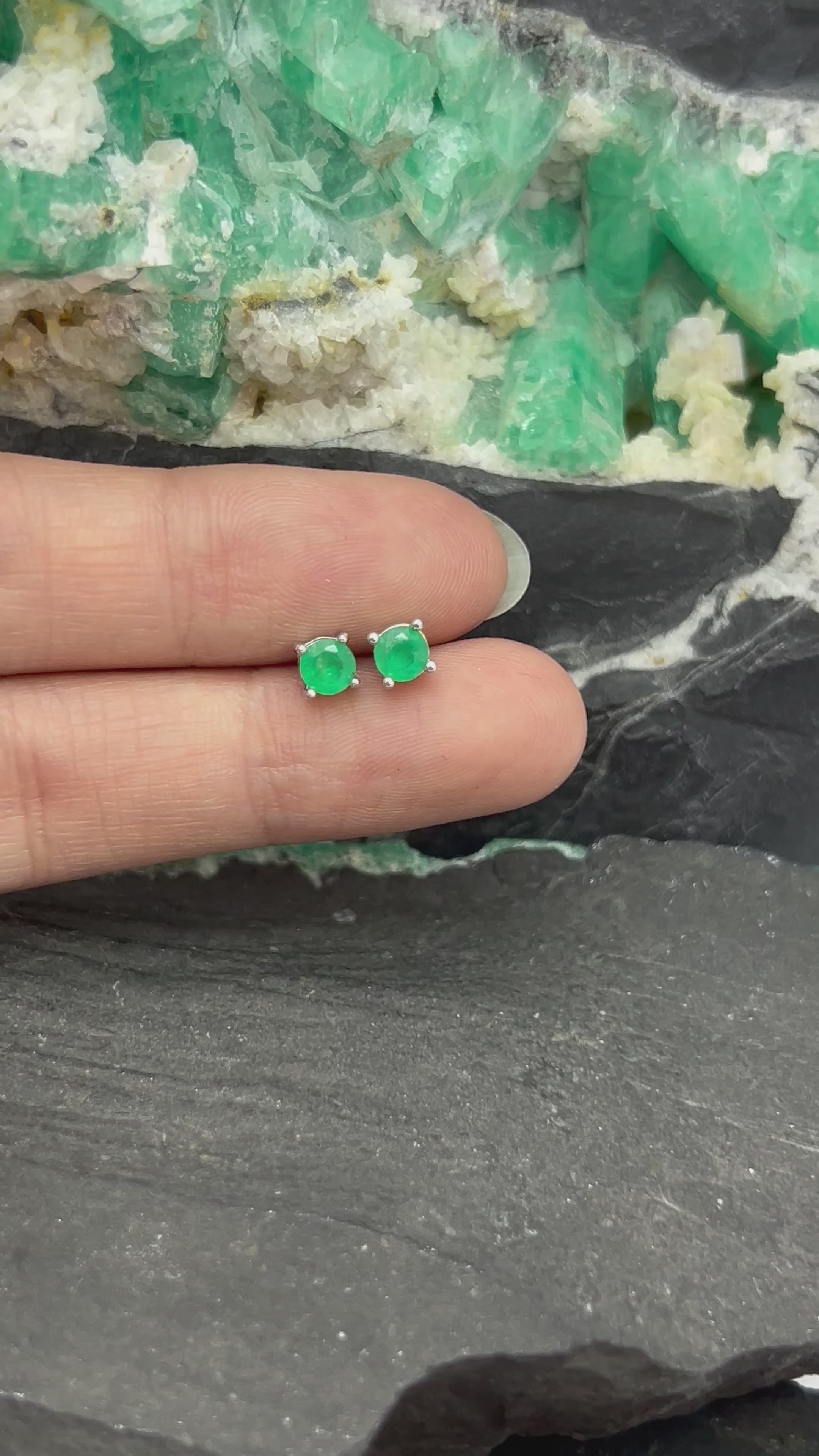 Pendientes sencillos de plata de ley con esmeralda redonda en engaste de cuatro puntas