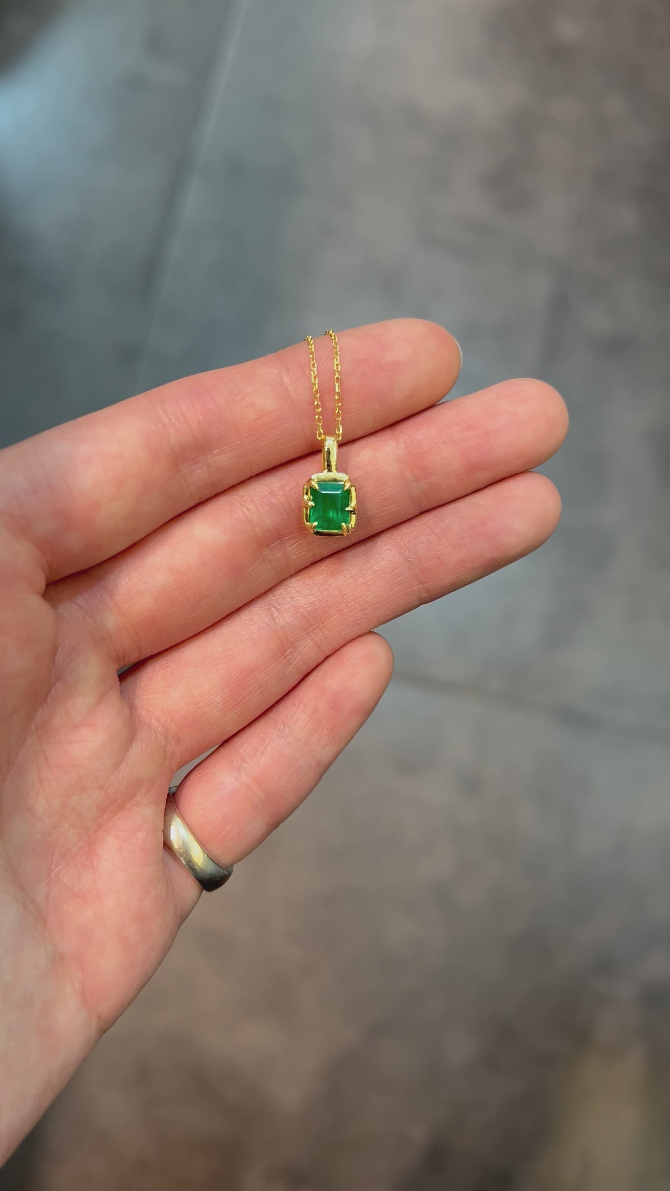 Sofisticado colgante de oro amarillo con esmeralda colombiana rectangular y engaste atrevido de seis puntas