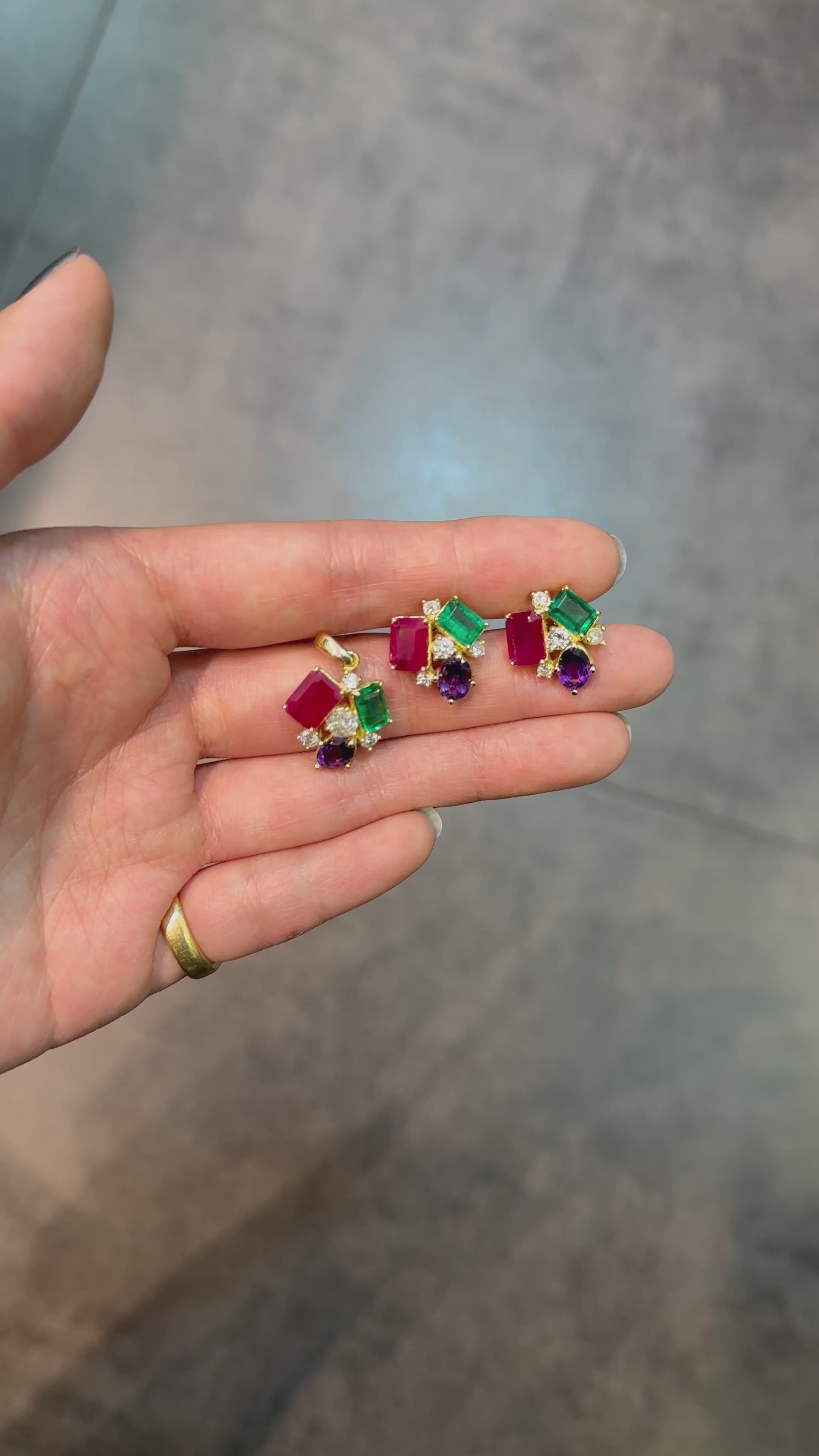 4-GemS Set in Yellow Gold with Emeralds, Amethysts, Diamonds, and Rubies