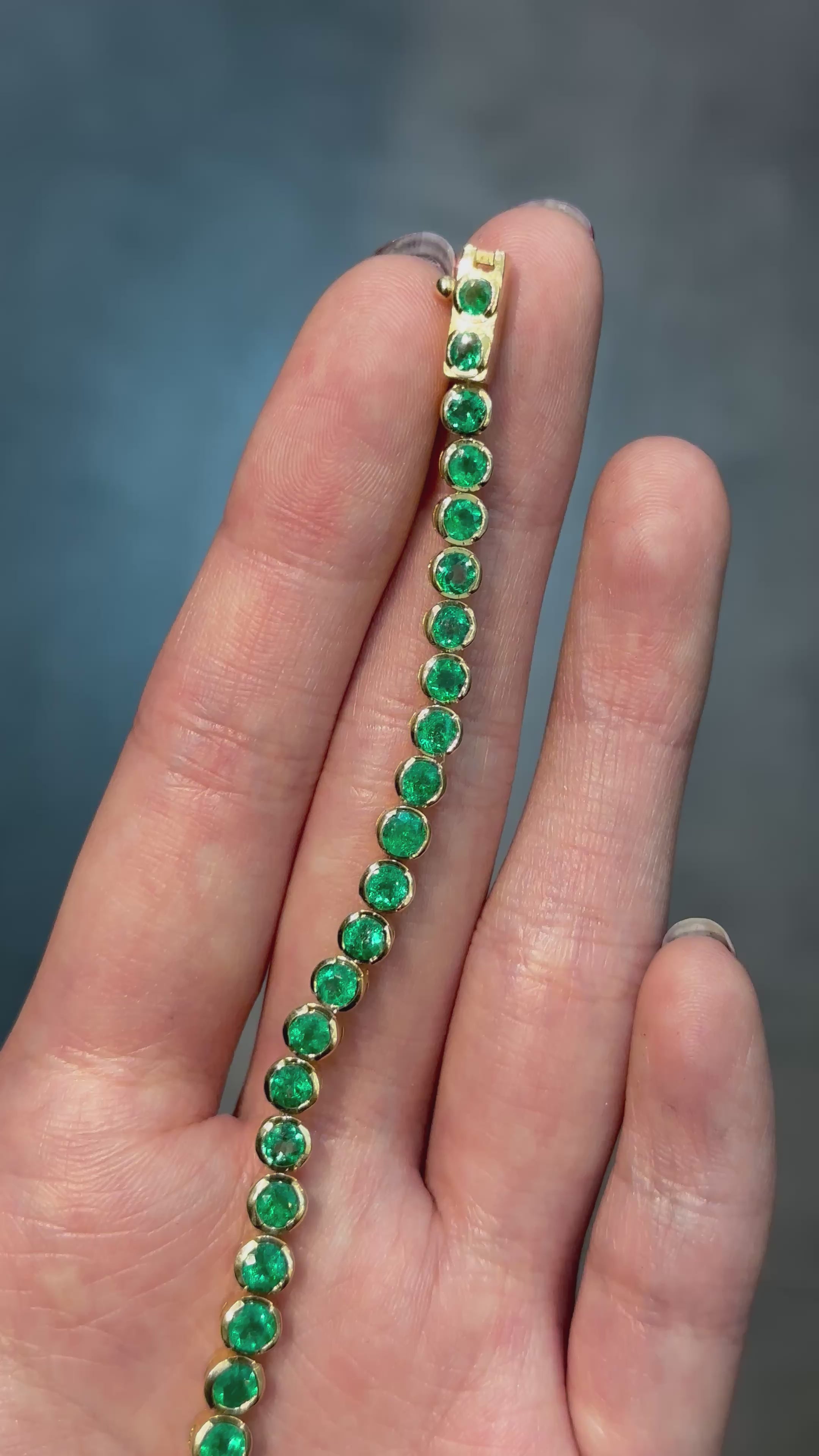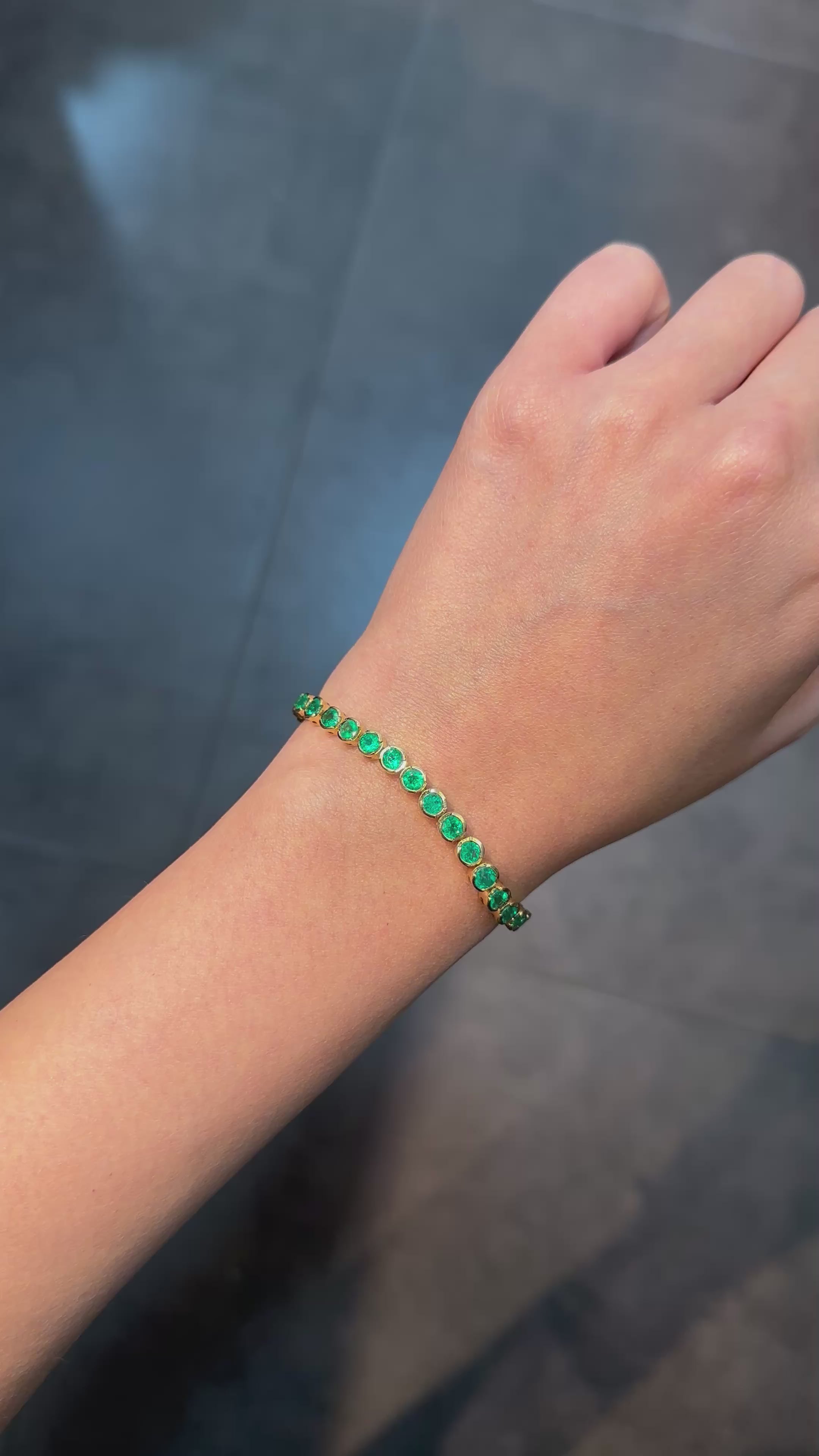 Tennis Bracelet in 18K Yellow Gold with Bezel-Set Round Colombian Emeralds