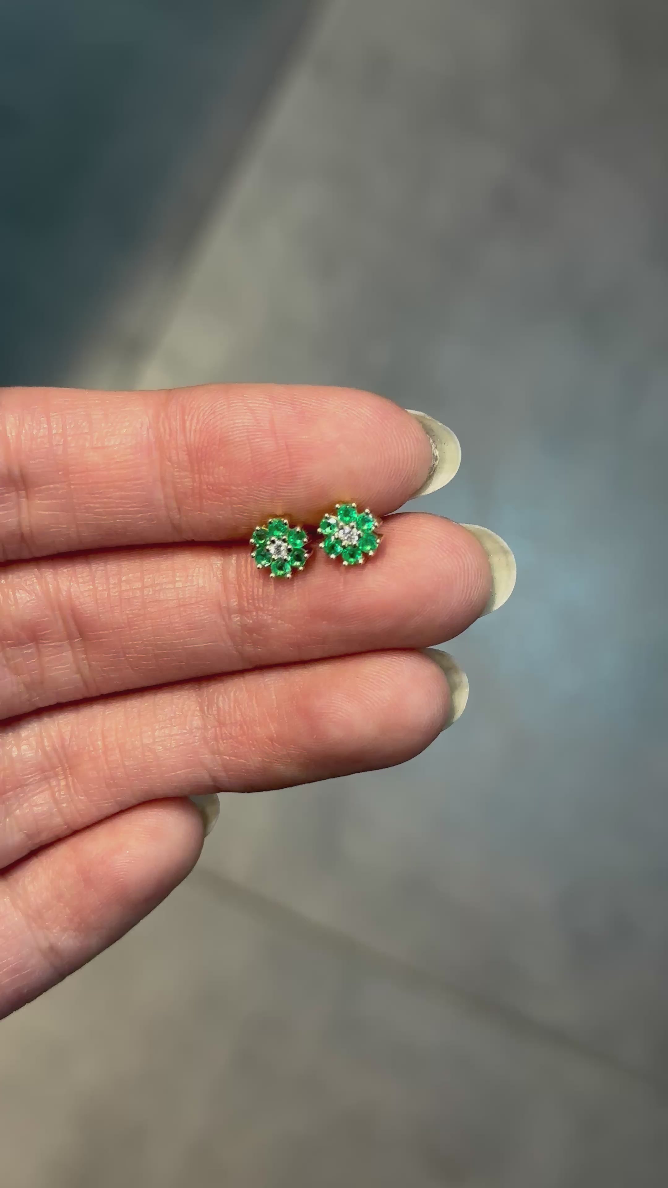 Six-Petal Flower Earrings with Central Diamond and Emerald Petals in 18K Gold