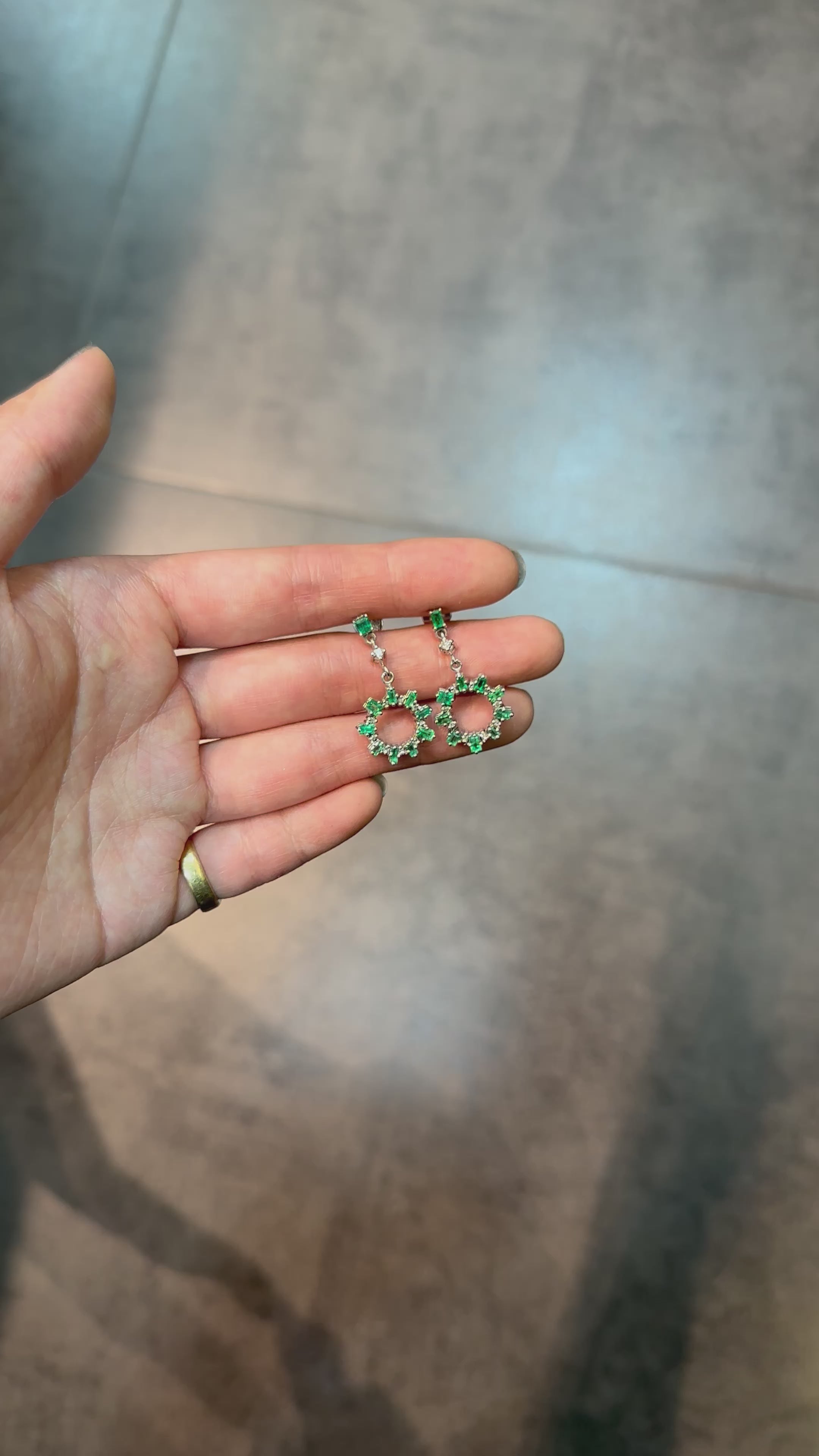 Elongated Earrings in White Gold with Baguette Emeralds, Diamonds, and Sunburst Detailing