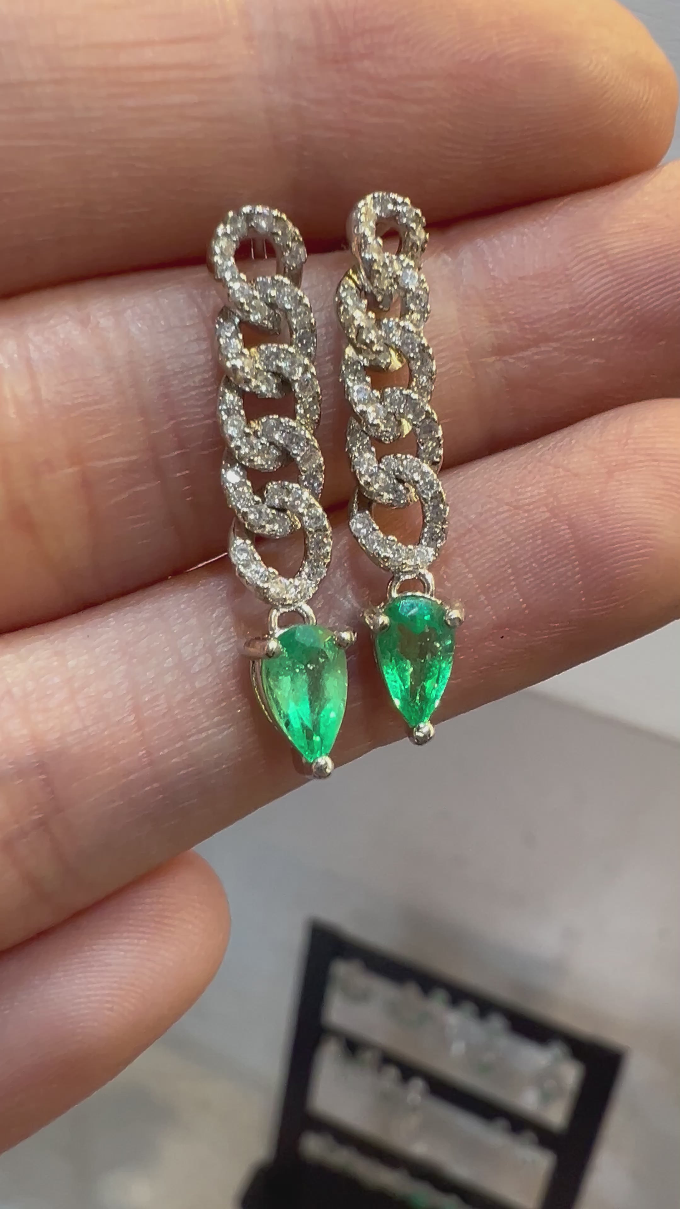 Boucles d'oreilles allongées en argent avec émeraudes colombiennes et chaînes en zircone