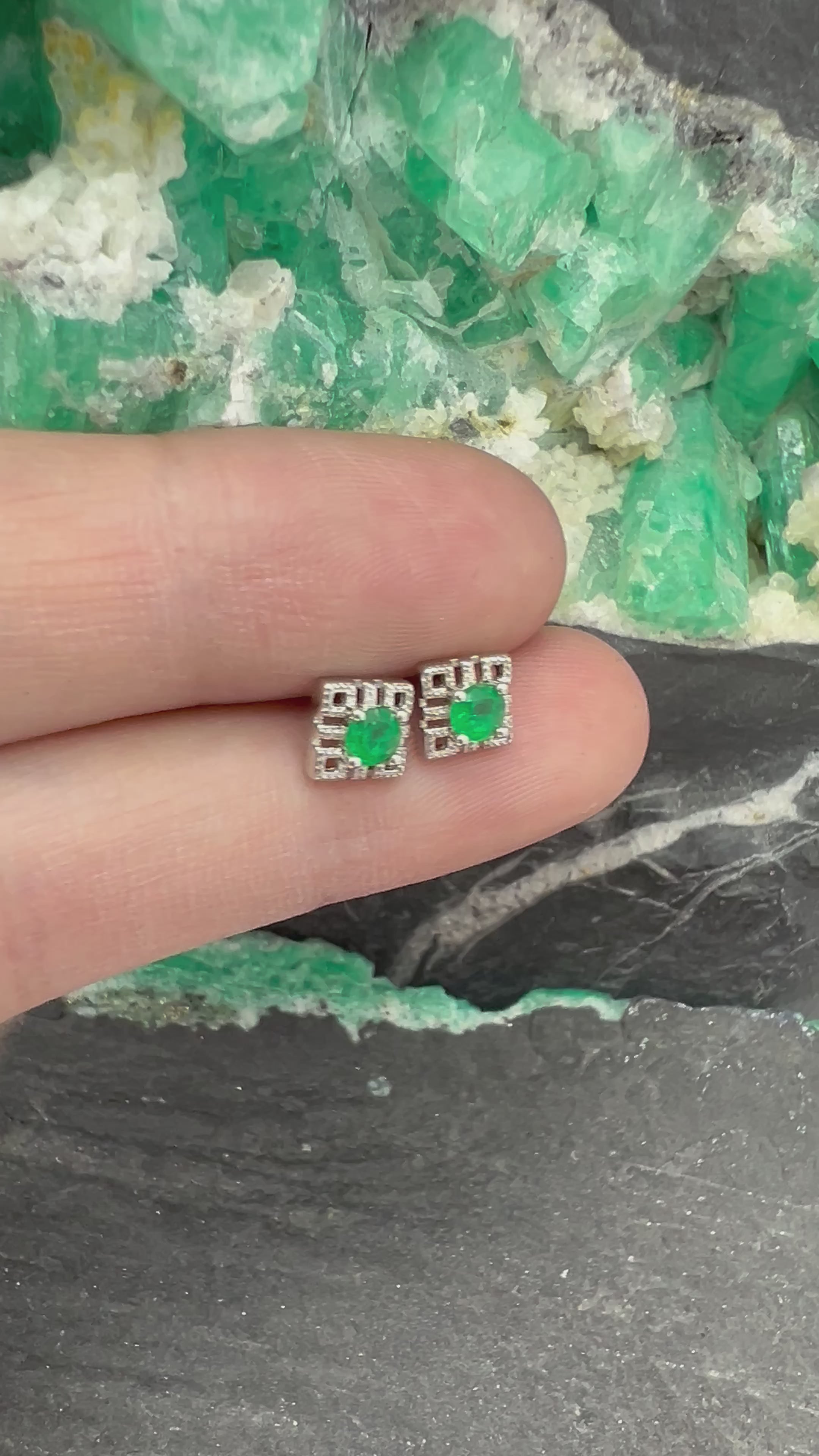 Petites boucles d'oreilles carrées en argent sterling avec émeraudes rondes centrales