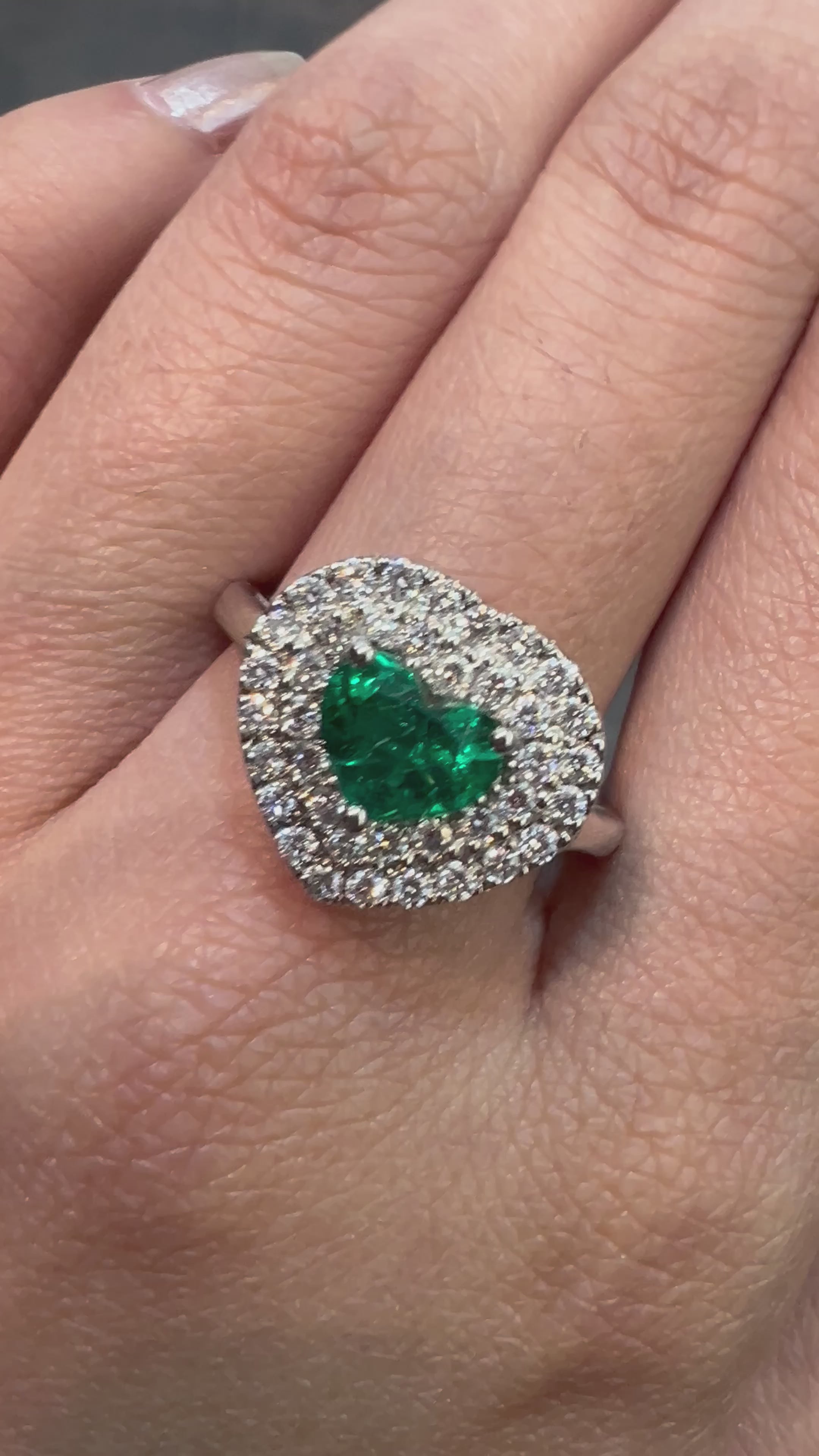 Bague en or blanc avec rangées d'émeraude et de diamants en forme de cœur