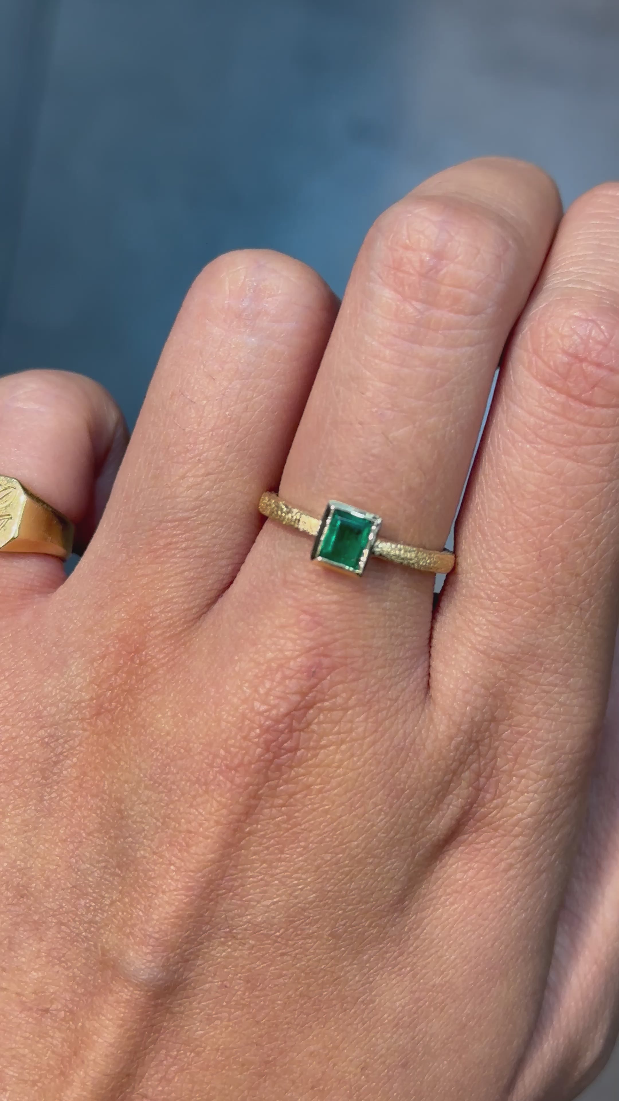 Yellow Gold Ring with 0.34 ct Baguette Emerald - Antique Style Textured Band
