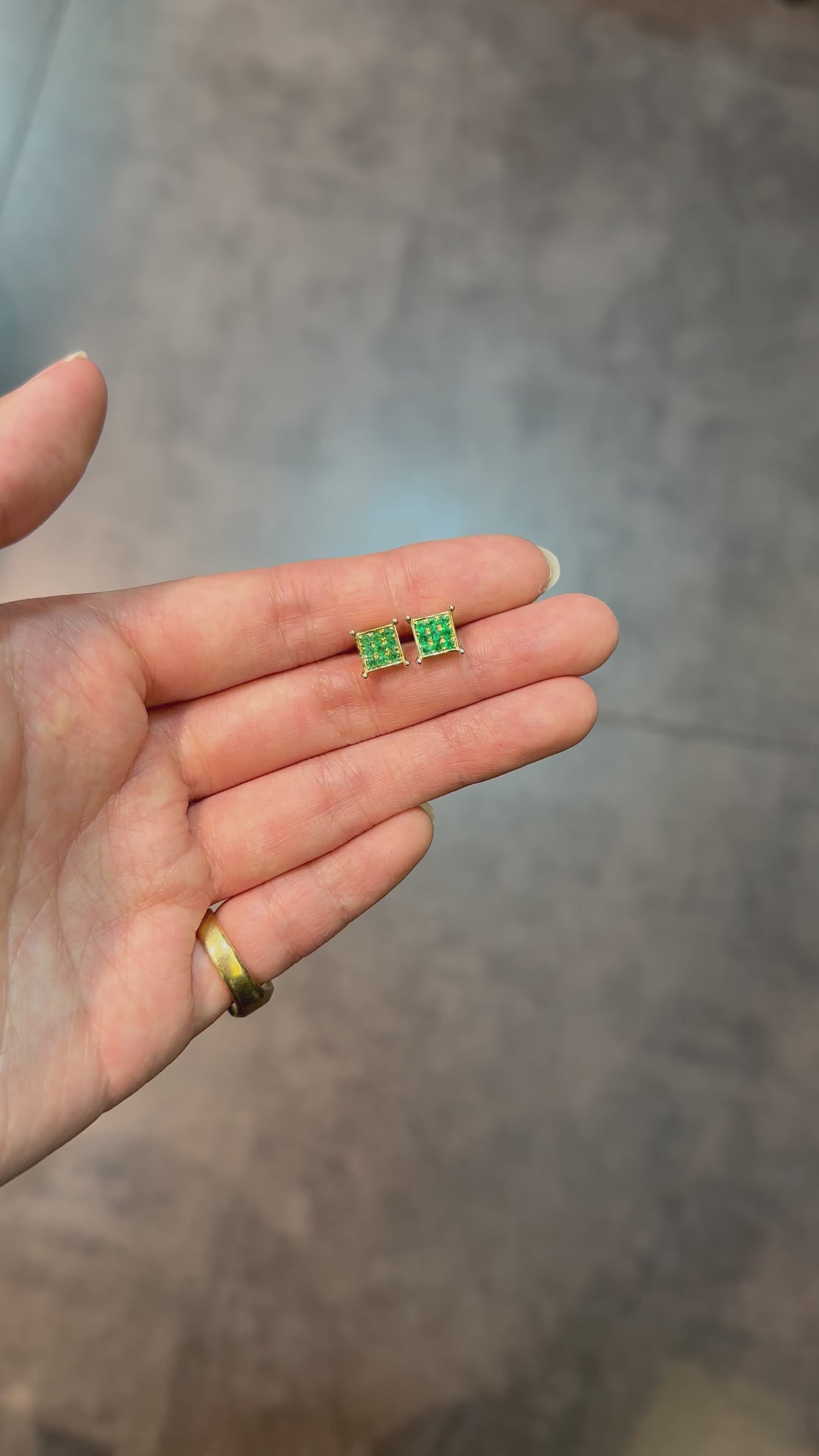 Yellow Gold Square Earrings with Tiny Round Emeralds at the Tips