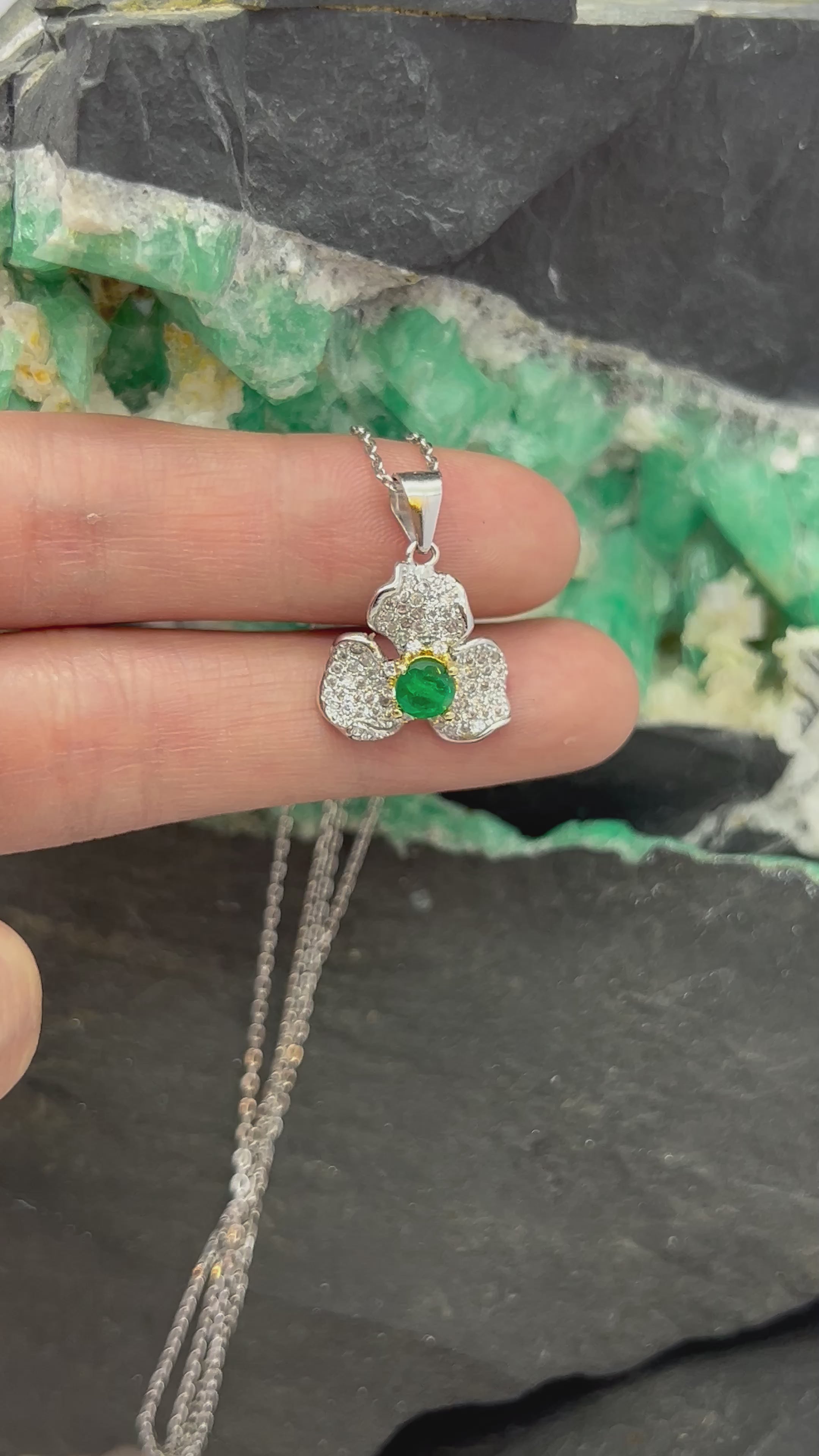 Exquisite Orchid Pendant with Central Emerald in Gold-Plated Prongs