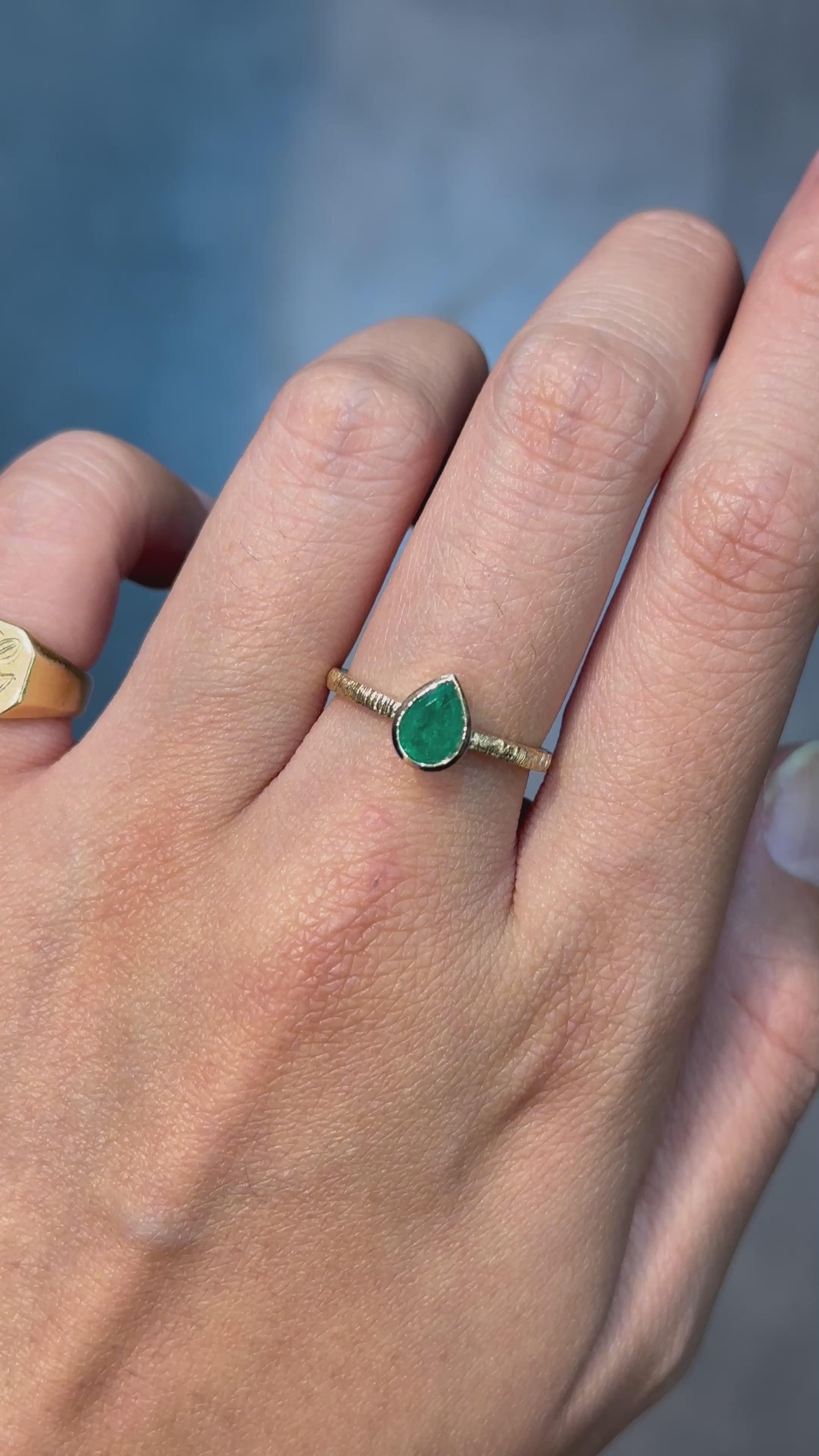 18K Yellow Gold Antique Textured Solitaire Ring with 0.61 ct Pear-Shaped Emerald Bezel-Set