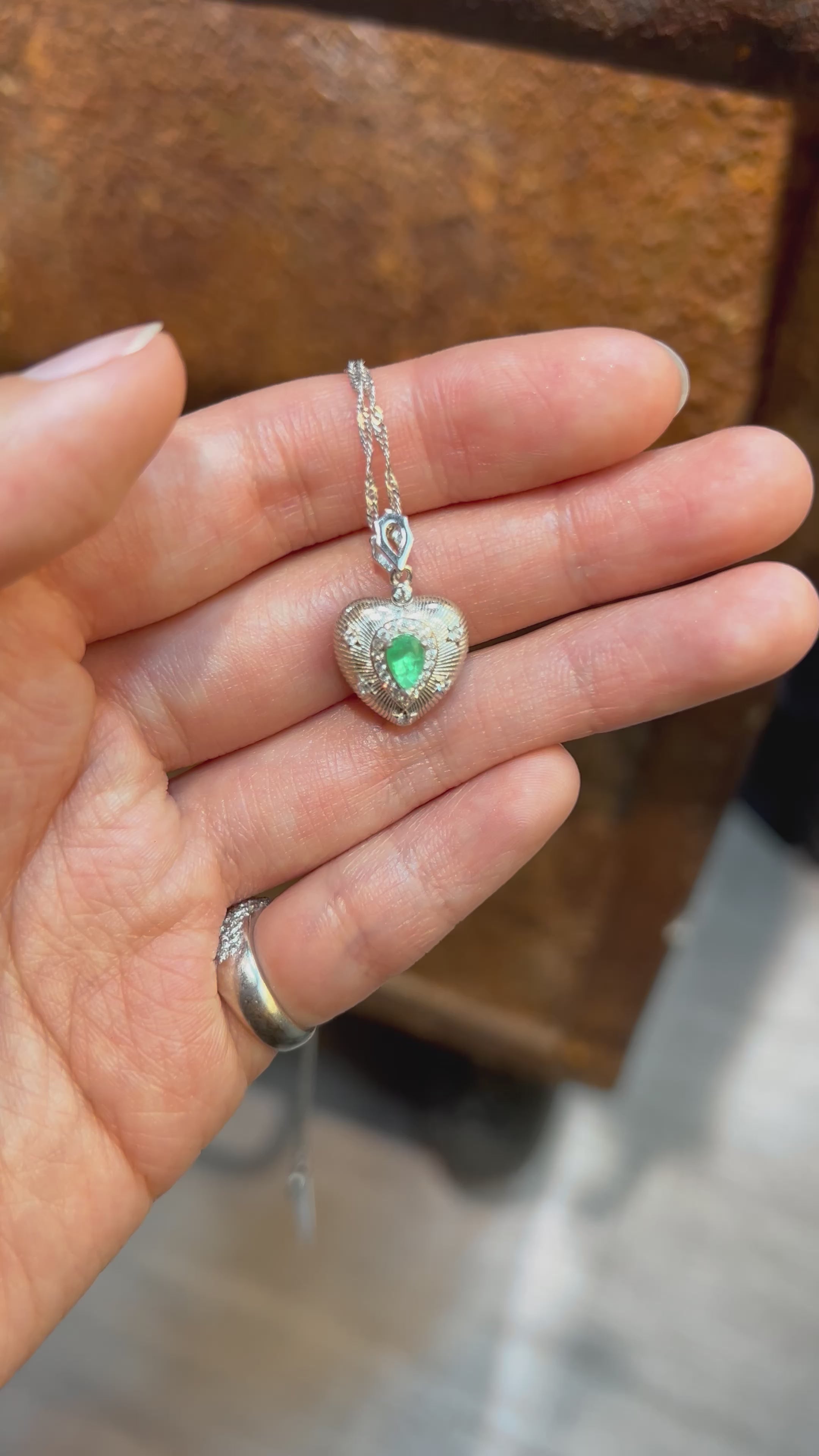Sterling Silver Heart Pendant with Inverted Teardrop Colombian Emerald, Zircon Halo, and Engraved Line Details